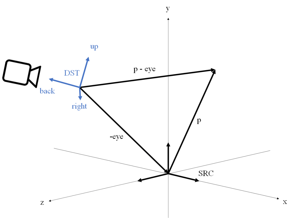 whose vectors are defined in world space and point right, up and back from the camera as their names imply. This defines another affine frame with its origin at